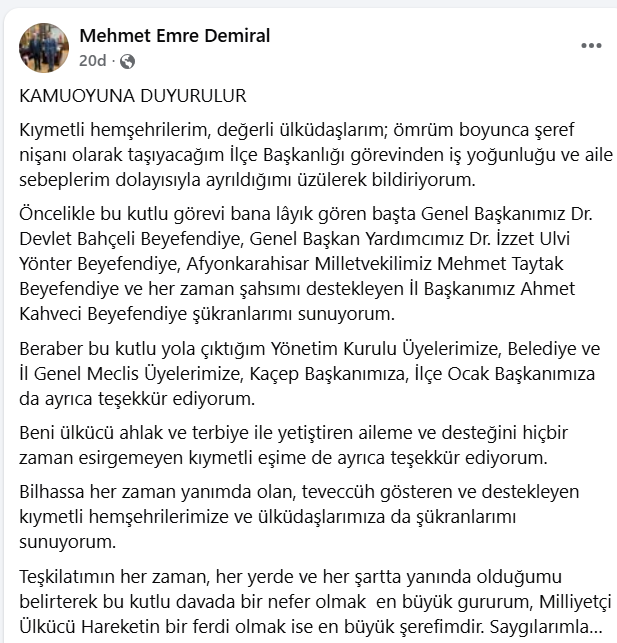 Konuyla ilgili Demiral şu açıklamayı yaptı: “Kıymetli hemşehrilerim, değerli ülküdaşlarım; ömrüm boyunca şeref nişanı olarak taşıyacağım İlçe Başkanlığı görevinden iş yoğunluğu ve aile sebeplerim dolayısıyla ayrıldığımı üzülerek bildiriyorum.