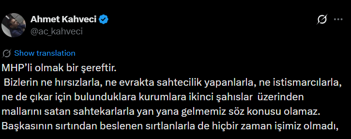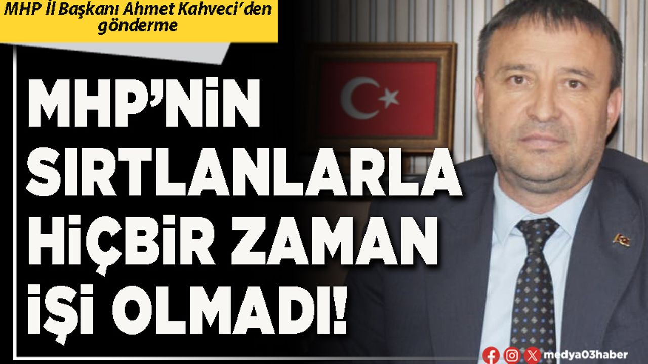 MHP İl Başkanı Ahmet Kahveci isim vermeden çok sert göndermelerde bulundu. X hesabından bir paylaşım yapan Kahveci şunları söyledi: “MHP’li olmak bir şereftir. Bizlerin ne hırsızlarla, ne evrakta sahtecilik yapanlarla, ne istismarcılarla, ne de çıkar için bulunduklara kurumlara ikinci şahıslar üzerinden mallarını satan sahtekarlarla yan yana gelmemiz söz konusu olamaz. Başkasının sırtından beslenen sırtlanlarla de hiçbir zaman işimiz olmadı.” ifadelerini kullandı.