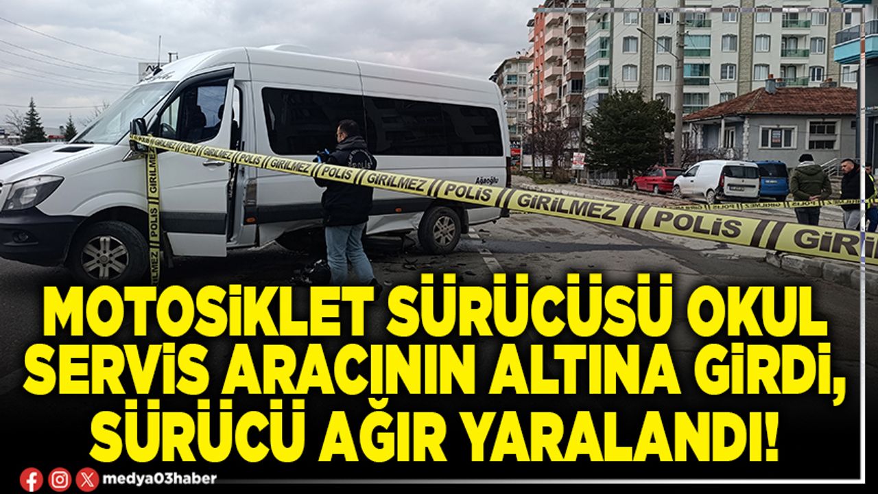 Kaza, Mareşal Fevzi Çakmak Bulvarı üzerinde meydana geldi. Edinilen bilgilere göre, Z.T. idaresindeki 03 S 0022 plakalı okul servis aracı, 34 AL 1208 plakalı motosikletle çarpıştı. Kazada minibüsün altına giren motosiklet parçalanırken, sürücü ise ağır yaralandı. Çevredekilerin yardımıyla aracın altından çıkarılan sürücü, olay yerine gelen ambulansla hastaneye kaldırıldı. Sürücünün durumunun ciddiyetini koruduğu bildirildi.