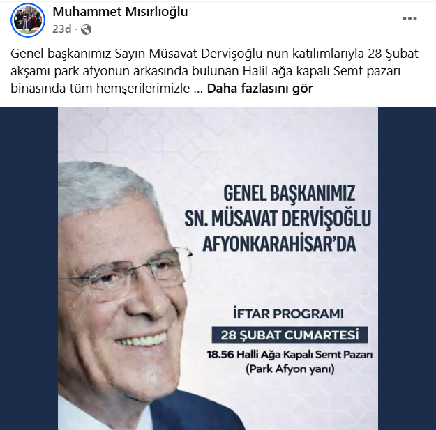 İYİ Parti Genel Başkanı Müsavat Dervişoğlu, İl Başkanlığı tarafından organize edilen iftar programına katılmak için Cumartesi günü Afyonkarahisar’a geliyor. Konuyla ilgili İYİ Parti Afyonkarahisar İl Başkanı Muhammet Mısırlıoğlu yaptığı paylaşımda şu ifadelere yer verdi: “Genel başkanımız Sayın Müsavat Dervişoğlu nun katılımlarıyla 28 Şubat akşamı Park Afyonun arkasında bulunan Halil ağa kapalı Semt pazarı binasında tüm hemşerilerimizle birlikte iftar yemeği programımız vardır programımıza tüm dava arkadaşlarımız ve hemşerilerimiz davetlidir.” denildi.