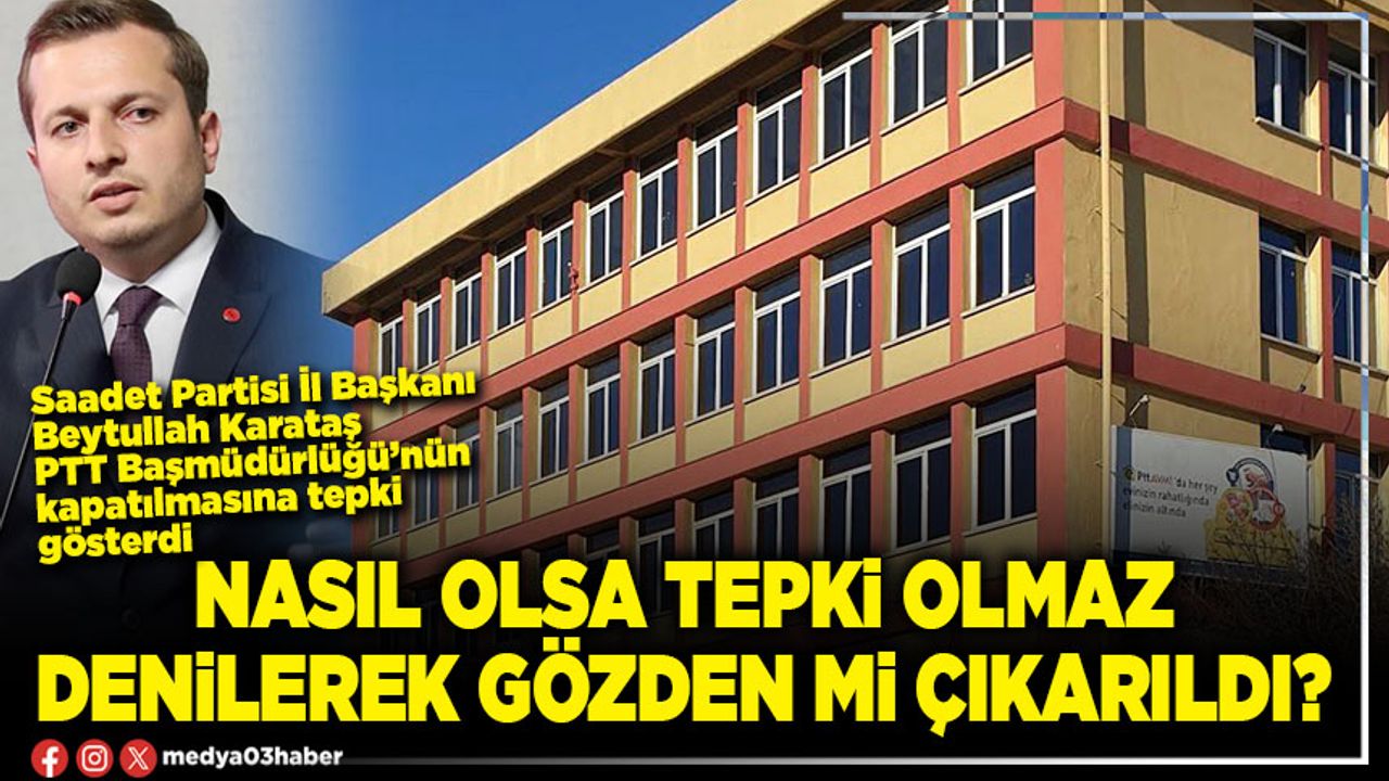 Afyonkarahisar PTT Başmüdürlüğü’nün kapatılmasını eleştiren Saadet Partisi İl Başkanı Beytullah Karataş, “Afyonkarahisar milletvekilleri bu süreçte neden sessiz kaldı? Yoksa Afyonkarahisar “nasıl olsa tepki olmaz” denilerek gözden mi çıkarıldı?” diye sordu.