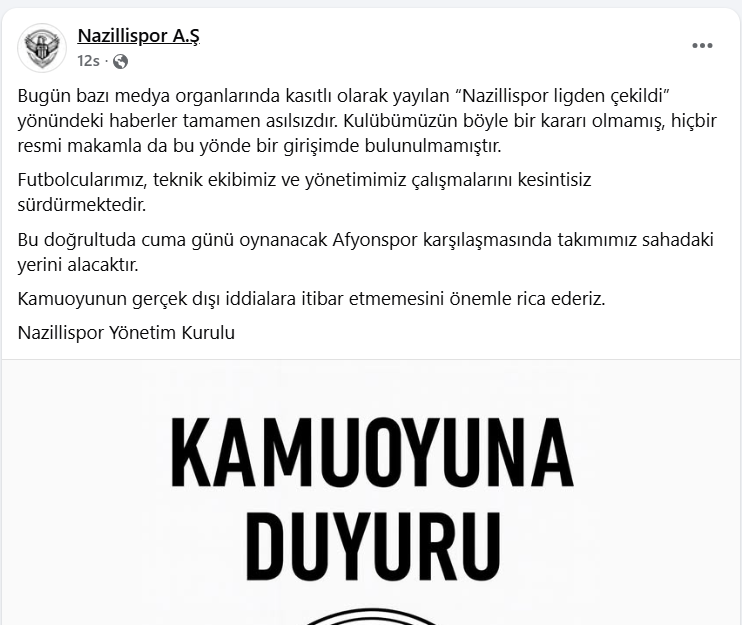 Konuyla ilgili Nazillispor Yönetim Kurulu’ndan yapılan paylaşım şöyle: “Bugün bazı medya organlarında kasıtlı olarak yayılan “Nazillispor ligden çekildi” yönündeki haberler tamamen asılsızdır. Kulübümüzün böyle bir kararı olmamış, hiçbir resmi makamla da bu yönde bir girişimde bulunulmamıştır.