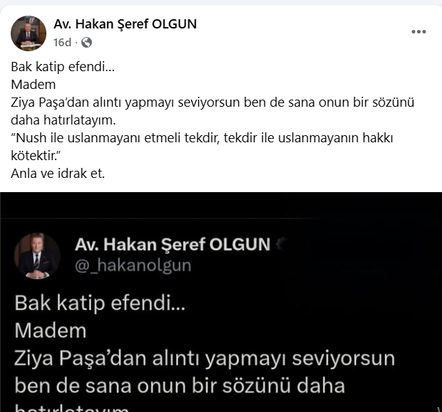 Yurdunuseven’e cevap veren İYİ Partili Hakan Şeref Olgun, “Bak katip efendi…
