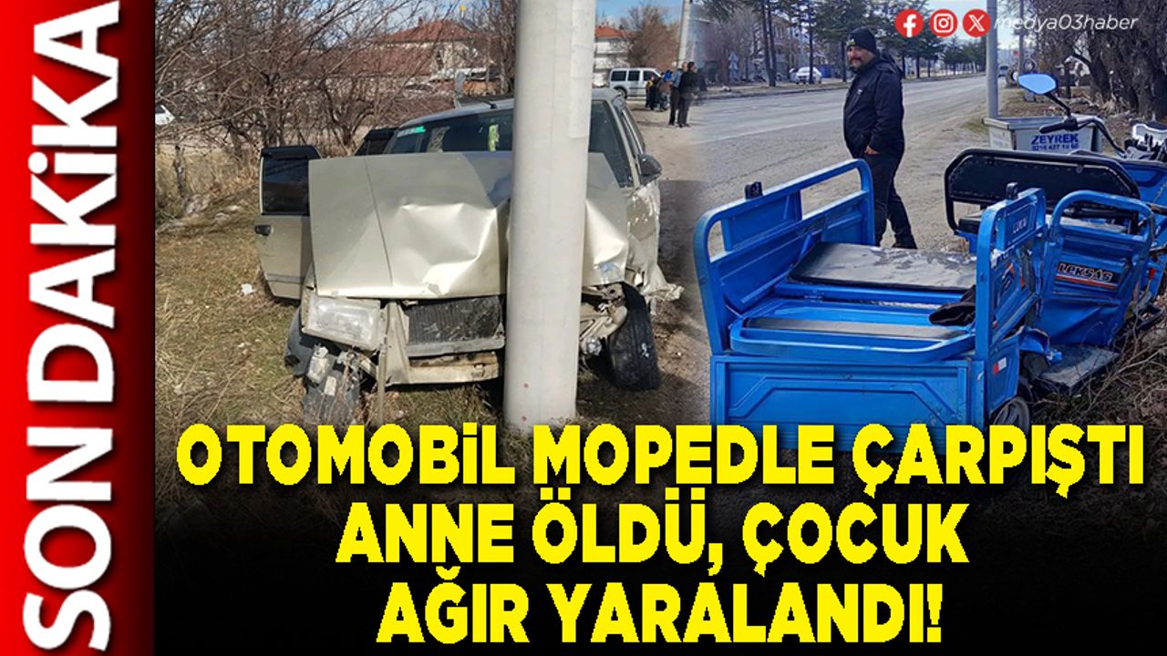 Kaza, Dinar ilçesine bağlı Tatarlı beldesinde meydana geldi. Edinilen bilgilere göre, E.D. (31) idaresindeki 42 U 9860 plakalı otomobil, Dinar-Çay kara yolu Tatarlı beldesi yakınlarında yolun karşısına geçmeye çalışan S.S'nin (48) kullandığı mopede çarptı. Çarpışmanın etkisiyle savrulan otomobil, yol kenarındaki elektrik direğine çarparak durabildi. Kazada moped sürücüsü S.S. ile oğlu D.S. ağır yaralandı. Yaralılar, kaza sonrası çevredekilerin haber vermesi üzerine olay yerine gelen ambulanslarla hastanelere kaldırıldı. Yaralılardan anne S.S. yapılan müdahaleye rağmen kurtarılamazken, oğlunun ise durumunun ciddiyetini koruduğu öğrenildi.