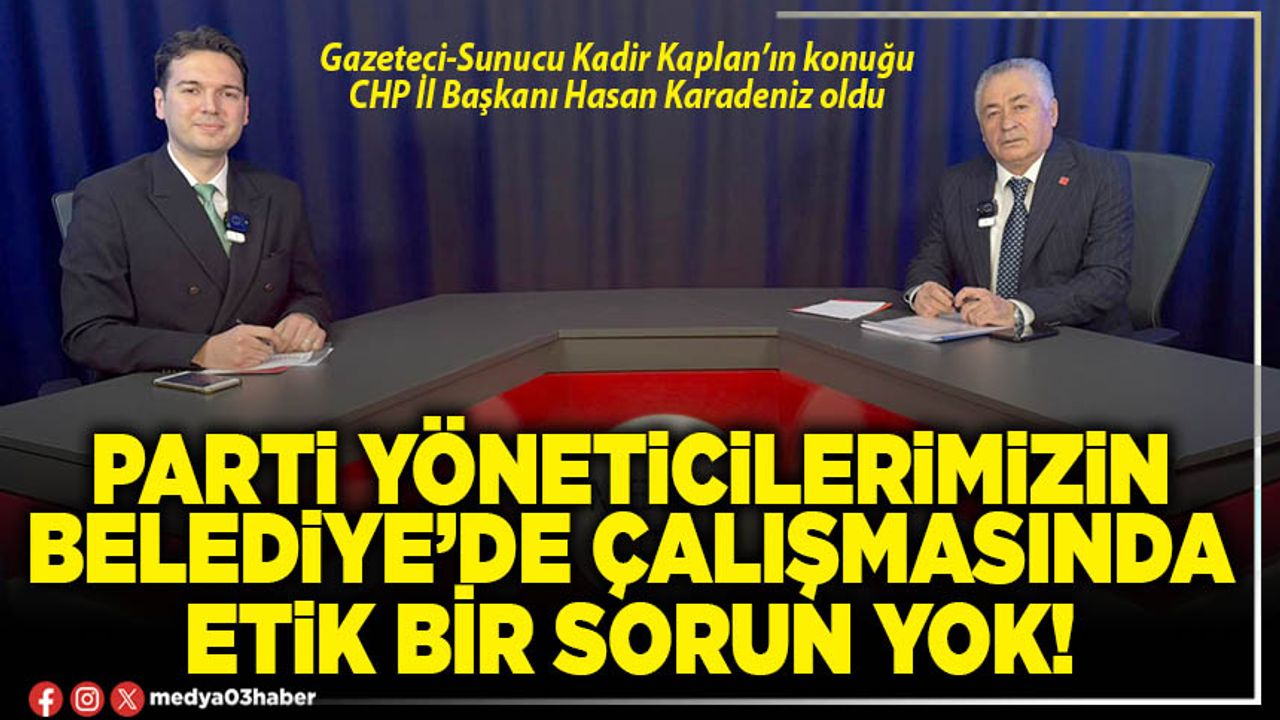 CHP İl Başkanı Hasan Karadeniz, Medya03’de ‘Siyaset Dünyası’ programında Gazeteci-Sunucu Kadir Kaplan’ın sorularını yanıtladı. Başkan Karadeniz Parti yöneticilerinin Belediye’de çalışmasıyla ilgili yapılan eleştirilere ve kuraklıkla mücadele eden Eber Gölü’yle ilgili açıklamalarda bulundu.
