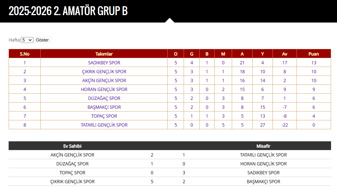Afyonkarahisar'da 2. Amatör Küme B grubunda 5. hafta dün oynanan 4 karşılaşmayla sona erdi. Futbolseverlerin 14 gol izlediği haftada lider Sadıkbeyspor, Topaçspor deplasmanında üç puana 3 golle uzandı. Haftanın en farklı galibiyetine Başmakçıspor'u sahasında 5-2 mağlup eden Çıkrık Gençlikspor imza attı. Çıkrıkspor bu galibiyetle lider Sadıkbeyspor’u takibini sürdürdü.