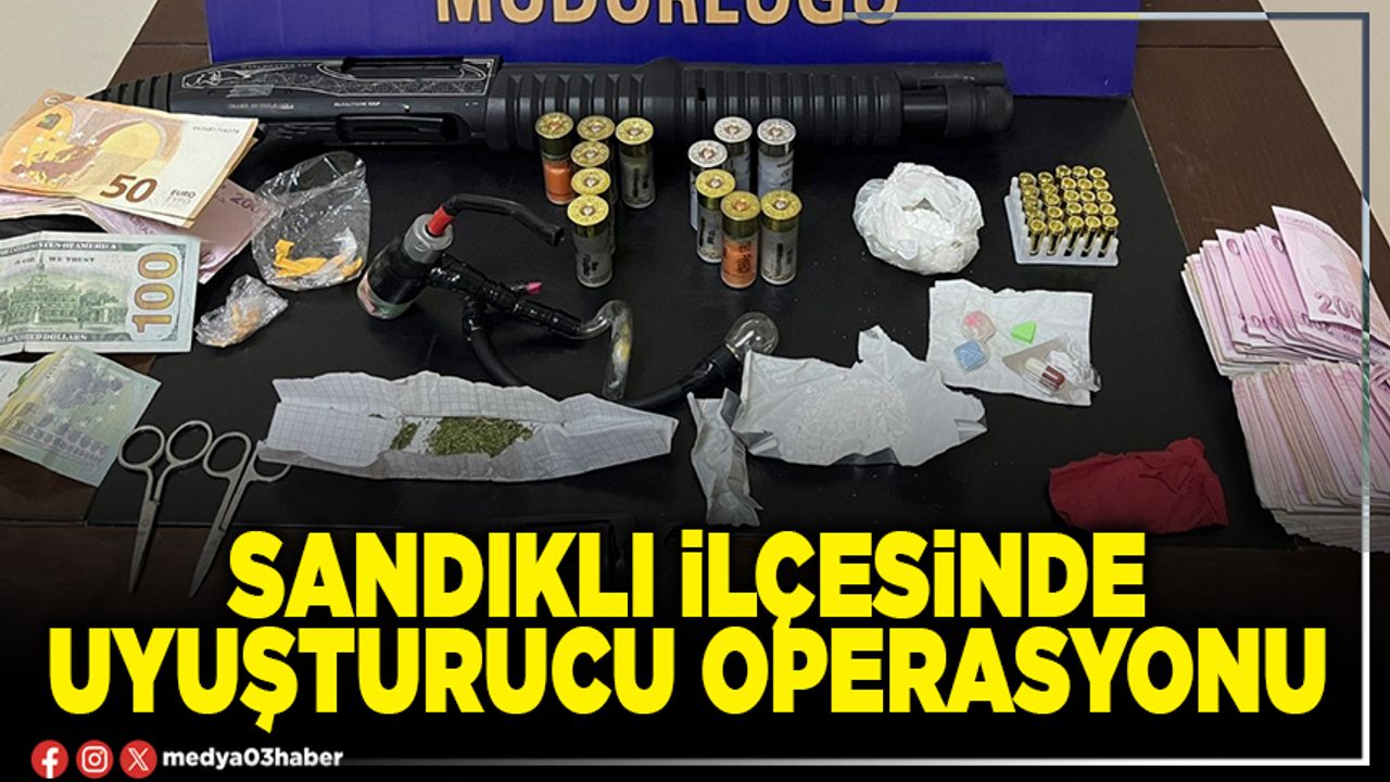 Sandıklı İlçe Emniyet Müdürlüğüne bağlı ekipler istihbarı çalışmaları sonrası uyuşturucu operasyonu düzenledi. Düzenlenen operasyonda ilçe merkezinde bir evde arama yapıldı. Yapılan arama da 43,75 gram kokain,16 gram metamfetamin, 2,12 gram esrar, 200 içimlik peçeteye emdirilmiş sentetik madde, 4 adet uyuşturucu hap, uyuşturucu madde içiminde kullanılan aparat, 2 ruhsatsız silah ile uyuşturucu satışından elde edildiği düşünülen 22 bin lira, 100 euro ve 100 dolar ele geçirildi. Operasyon sonrası gözaltına alınan 2 şahıstan biri sevk edildiği mahkeme tarafından tutuklanırken biri ise adli kontrol şartı ile serbest bırakıldı.
