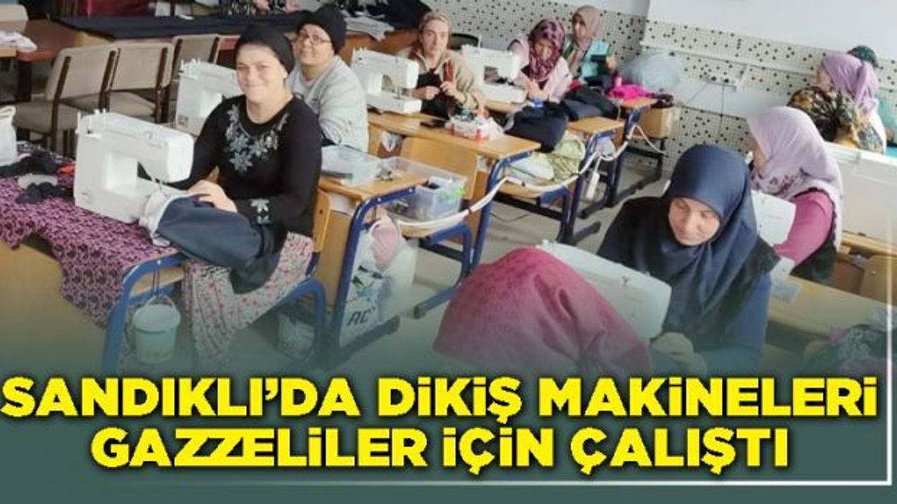 Sandıklı Halk Eğitimi Merkezinde öğretmenler, usta öğreticiler ve kursiyerler İsrail'in saldırılarının hedefi olan Gazze'deki kadın ve çocuklar için battaniye, polar içlik, iç çamaşırı, yenidoğan seti, eşofman takımı bere ve atkı dikiyor.