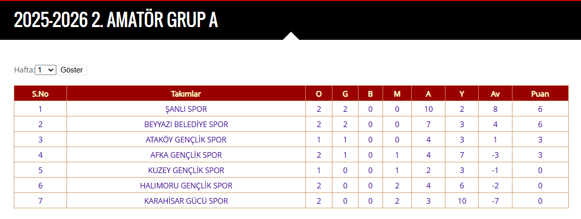2. Amatör Küme A grubunda bugün 3 karşılaşma oynandı. Haftanın en farklı galibiyetine imza atan Şanlıspor, Karahisargücüspor’u Umut Öztürk (3), Azim Evran ve Muhammed Acar’ın golleriyle 5-1 mağlup ederek 2. haftada averajla zirvedeki yerini korudu.