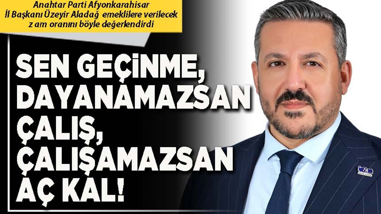 TÜİK verilerine göre emeklilere verilecek zam oranlarının belli olmasına muhalefet partilerinden sert eleştiriler gelmeye başladı. Anahtar Parti İl Başkanı Üzeyir Aladağ’da yaptığı yazılı açıklamada, “Emekliye verilen zamlar derhal gerçek enflasyon oranlarına göre yeniden düzenlenmelidir.” dedi.