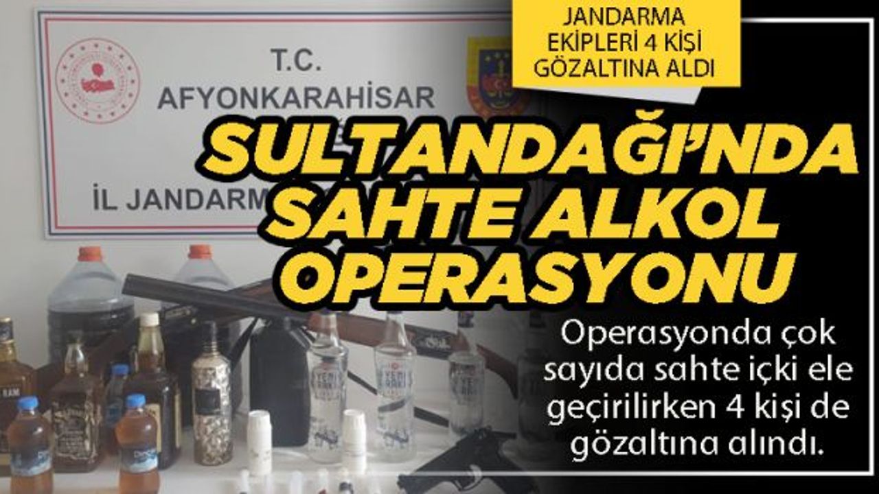 Afyonkarahisar İl Jandarma Komutanlığı ekipleri, Sultandağı ilçesinde sahte/kaçak alkol ticareti yapan kişilere yönelik yaptığı operasyonda 25 litre viski, 10 litre rakı, 100 gram alkol üretiminde kullanılan alkol kiti ele geçirdi. C.K., H.E., M.E. ve U.T.G. isimli şahısların gözaltına alındığı operasyonda ayrıca 2 adet av tüfeği ile 1 adet kurusıkı tabanca ele geçirildi. Şüpheli şahıslara 10.981 TL. para cezası kesilirken, olayla ilgili tahkikat devam ettiği öğrenildi.