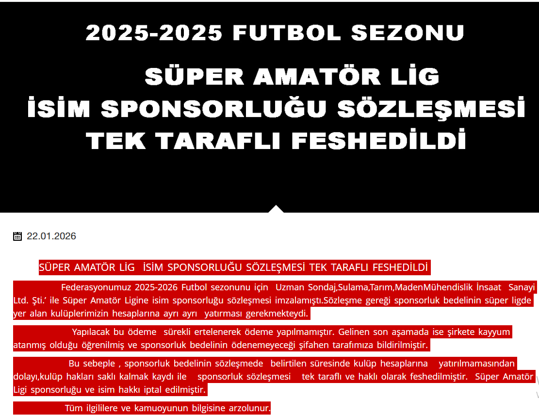 Konuyla ilgili ASKF’den yapılan açıklamada şu ifadelere yer verildi: “Federasyonumuz 2025-2026 Futbol sezonunu için Uzman Sondaj, Sulama, Tarım, Maden Mühendislik İnsaat Sanayi Ltd. Şti. ile Süper Amatör Ligine isim sponsorluğu sözleşmesi imzalamıştı. Sözleşme gereği sponsorluk bedelinin süper ligde yer alan kulüplerimizin hesaplarına ayrı ayrı yatırması gerekmekteydi.