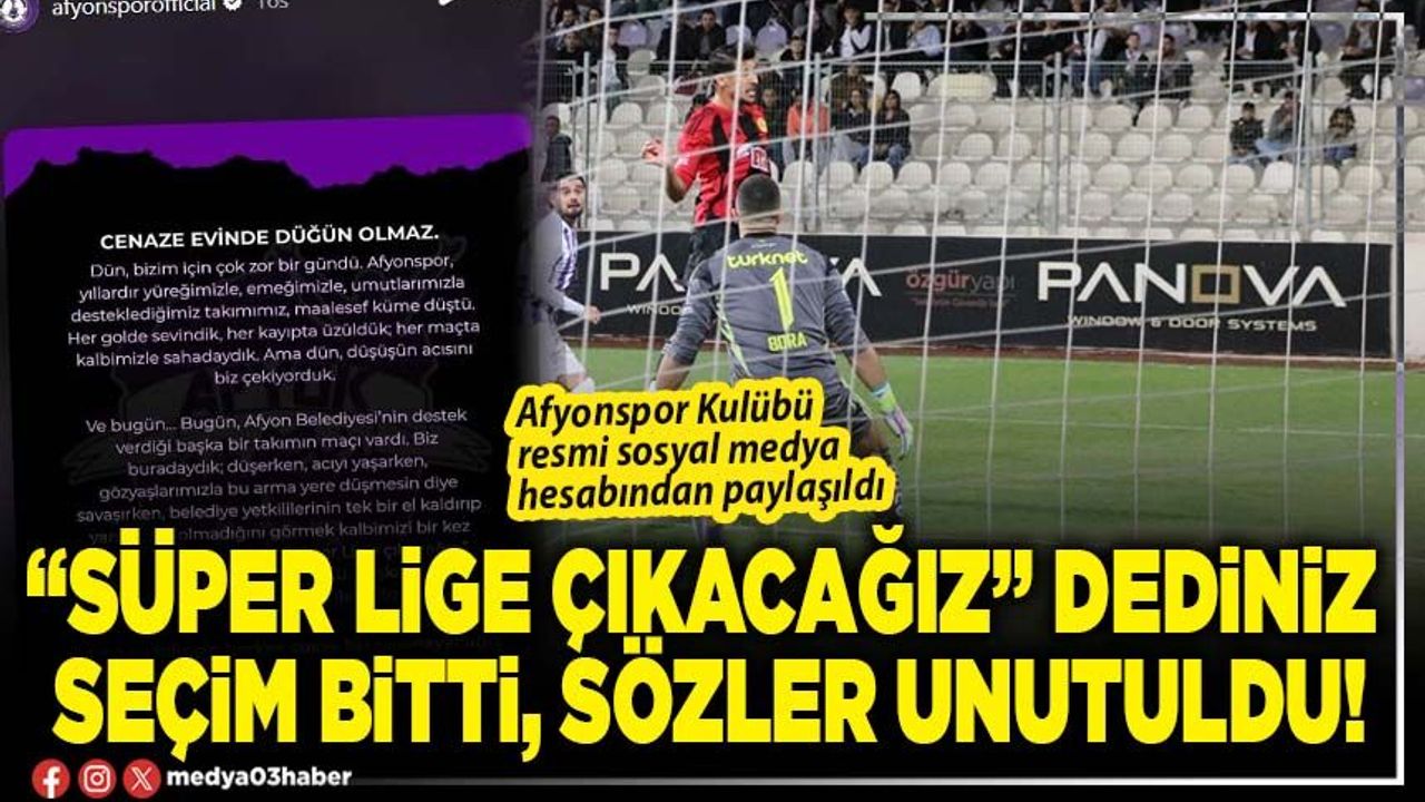 “Cenaze evinde düğün olmaz” başlığıyla yapılan paylaşımda şu ifadelere yer verildi: “Dün bizim için çok zor bir gündü. Afyonspor, yıllardır yüreğimizle, emeğimizle, umutlarımızla desteklediğimiz takımımız, maalesef küme düştü. Her golde sevindik, her kayıpta üzüldük; her maçta kalbimizle sahadaydık. Ama dün, düşüşün acısını biz çekiyorduk. Ve bugün... Bugün, Afyon Belediyesi'nin destek verdiği başka bir takımın maçı vardı. Biz buradaydık; düşürken, acıyı yaşarken, gözyaşlarımızla bu arma yere düşmesin diye savaşırken, Belediye yetkililerinin tek bir el kaldırıp yanımızda olmadığını görmek kalbimizi bir kez daha kırdı. Sözler vardı: "Süper Lig'e çıkacağız." Ama seçim bitti, sözler unutuldu. Başka takımlar, başka salonlar, başka tribünler... Biz yalnız bırakıldık. Ama şu bilinsin herkes sussa biz susmayacağız.”