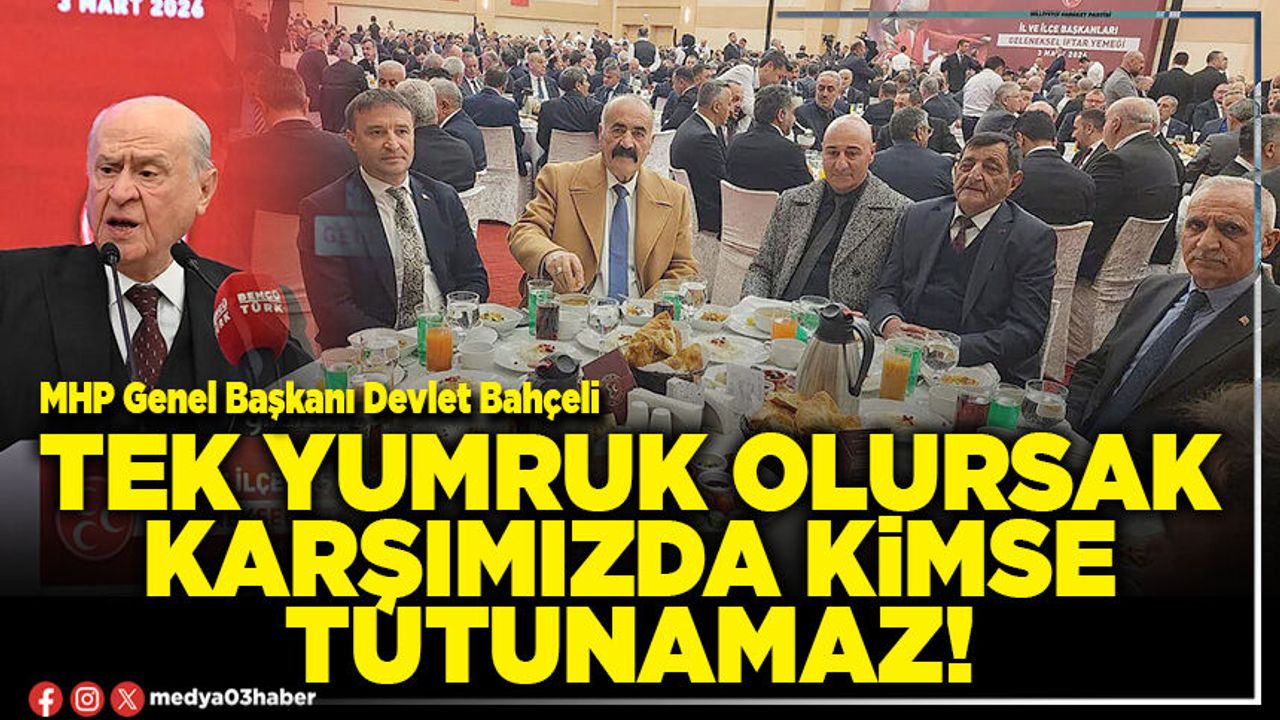 Milliyetçi Hareket Partisi Genel Başkanı Devlet Bahçeli, Ankara’da düzenlenen iftar programında teşkilat mensuplarına hitap etti. Programa İl Başkanı Ahmet Kahveci ve ilçe başkanları da katılım sağladı. MHP Genel Başkanı Devlet Bahçeli, il ve ilçe başkanlarının katılımıyla düzenlenen iftar programında kapsamlı bir konuşma yaptı. Teşkilat mensuplarına hitap eden Bahçeli, 57 yıllık Milliyetçi Hareket Partisi geçmişinin en güçlü dayanağının teşkilat yapısı olduğunu vurgulayarak, “Bizler tek yumruk olursak karşımızda kimse tutunamaz” ifadelerini kullandı.