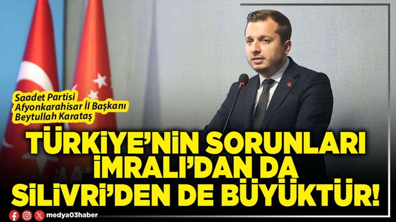 Saadet Partisi Afyonkarahisar İl Başkanı Beytullah Karataş, Türkiye’de gündemi meşgul eden İmralı tartışmalarına sert eleştiriler yöneltti. Karataş, “Türkiye’nin sorunları da, umutları da İmralı’dan da Silivri’den de büyüktür. 1 kişinin umut hakkı, 86 milyon insanımızın umudundan asla büyük değildir!” ifadelerini kullanırken kimin İmralı’ya gideceği, nasıl gidileceği veya kimlerle görüşüleceği yönündeki tartışmaların “gündem saptırma” çabası olduğunu belirterek, sürecin kişilere indirgenmesinin meseleyi sulandırdığını söyledi.