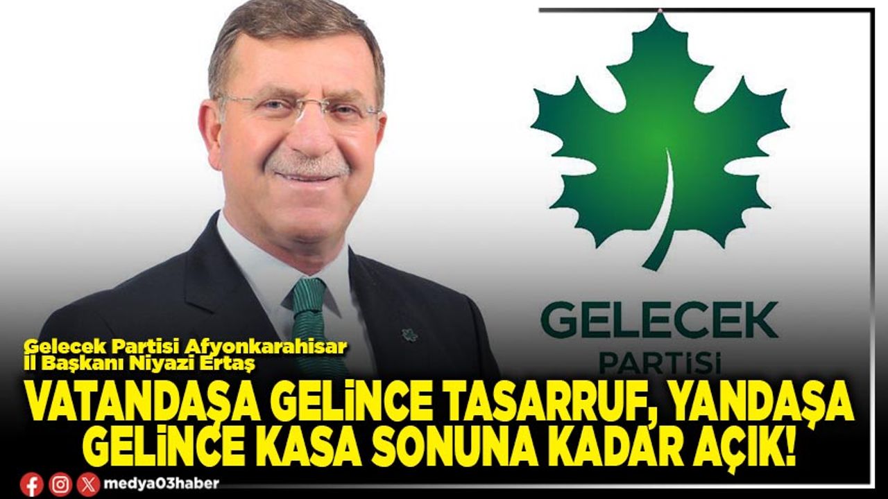 Gündeme ilişkin açıklamalarda bulunan Gelecek Partisi Afyonkarahisar İl Başkanı Niyazi Ertaş şunları söyledi: “İçerisinde bulunduğumuz ekonomik sıkıntıların, vatandaşlarımızın gün geçtikçe alım gücünün düştüğü ve her geçen gün halkımızın fakirleştiği, gelir adaletsizliğinin arttığı şu günlerde, kamu kurum ve kuruluşlarında tasarruf tedbirleri adı altında uygulanan yaptırımlar nelerdir? Vatandaşa gelince tasarruf var. Fakat yandaşlara gelince kasanın sonuna kadar açık olduğu, emekliye, işçiye, memura, asgari ücretliye hak ettikleri ücreti verirken hazinede para yok. Fakat iktidara yakın kişilere gelince para var.