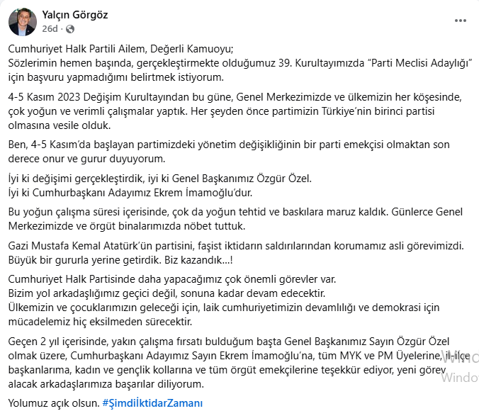Konuyla ilgili Yalçın Görgöz sosyal medya hesabından şu paylaşımı yaptı: “Sözlerimin hemen başında, gerçekleştirmekte olduğumuz 39. Kurultayımızda “Parti Meclisi Adaylığı” için başvuru yapmadığımı belirtmek istiyorum.
