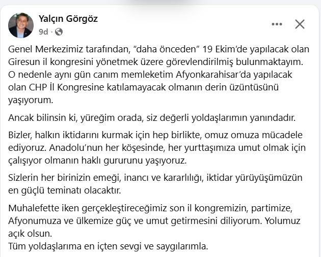 O nedenle aynı gün canım memleketim Afyonkarahisar’da yapılacak olan CHP İl Kongresine katılamayacak olmanın derin üzüntüsünü yaşıyorum.