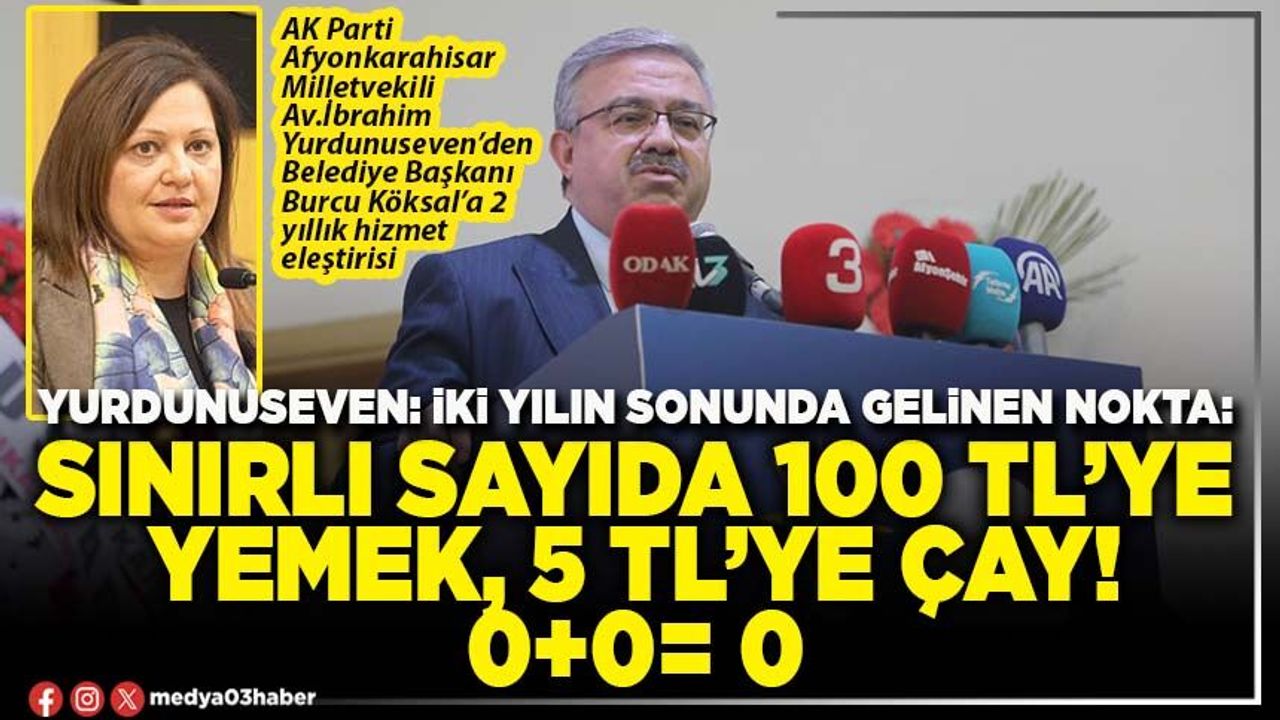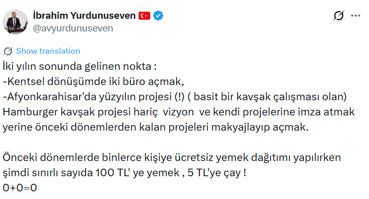 Konuyla ilgili AK Parti Afyonkarahisar Milletvekili Av.İbrahim Yurdunuseven’in yaptığı paylaşım şöyle: “İki yılın sonunda gelinen nokta : -Kentsel dönüşümde iki büro açmak, -Afyonkarahisar'da yüzyılın projesi (!) ( basit bir kavşak çalışması olan) Hamburger kavşak projesi hariç vizyon ve kendi projelerine imza atmak yerine önceki dönemlerden kalan projeleri makyajlayıp açmak. Önceki dönemlerde binlerce kişiye ücretsiz yemek dağıtımı yapılırken şimdi sınırlı sayıda 100 TL' ye yemek , 5 TL'ye çay !” ifadelerini kullandı.